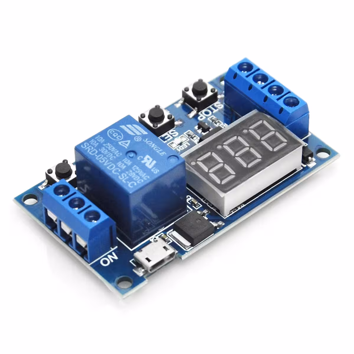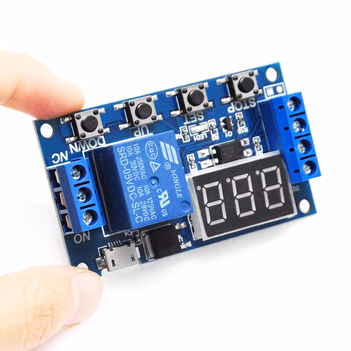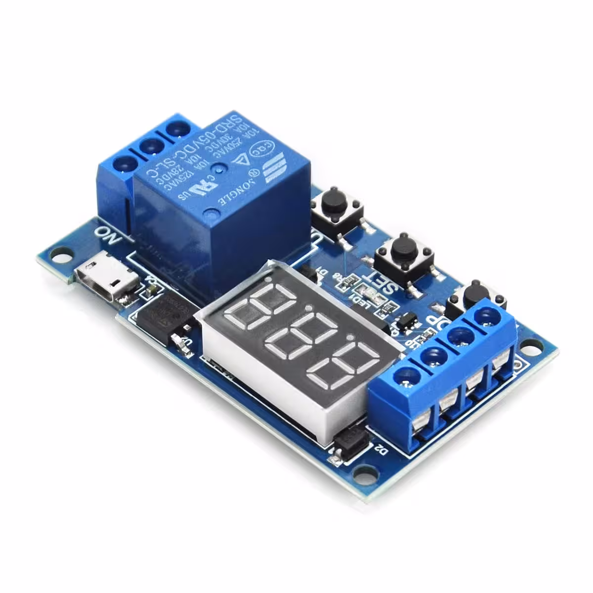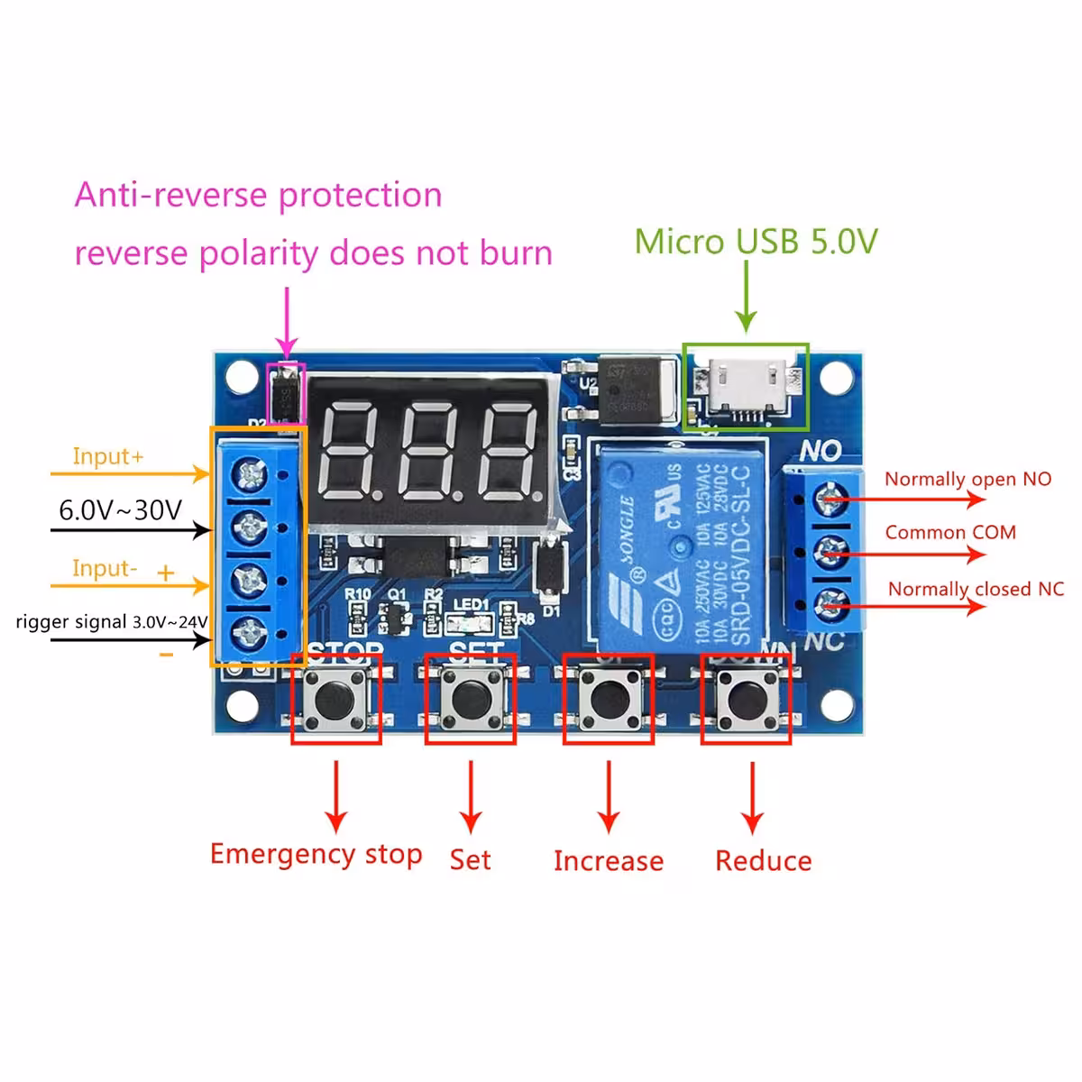 Modul relé s nastavitelným zpožděním a časem, kompatibilní 6–30V (napájení přes MicroUSB 5V možné). Ideální pro průmyslové aplikace a DIY projekty vyžadující modul relé se zpožděním, ovládáním a nastavitelným časem, s digitálním displejem a odolností proti rušení.