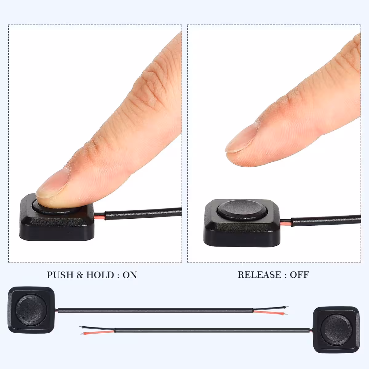 Sada 2 ks mini tlačítek pro 12V / 24V, navržených pro povrchovou montáž v automobilových, motocyklových, lodních, průmyslových a elektronických projektech. Tlačítka jsou předem zapojena (2 piny: červený = „+“, černý = „–“). Funkce bez zajištění je aktivuje pouze po dobu stisku, což je ideální pro ovládání s nízkou spotřebou a rychlou signalizaci.