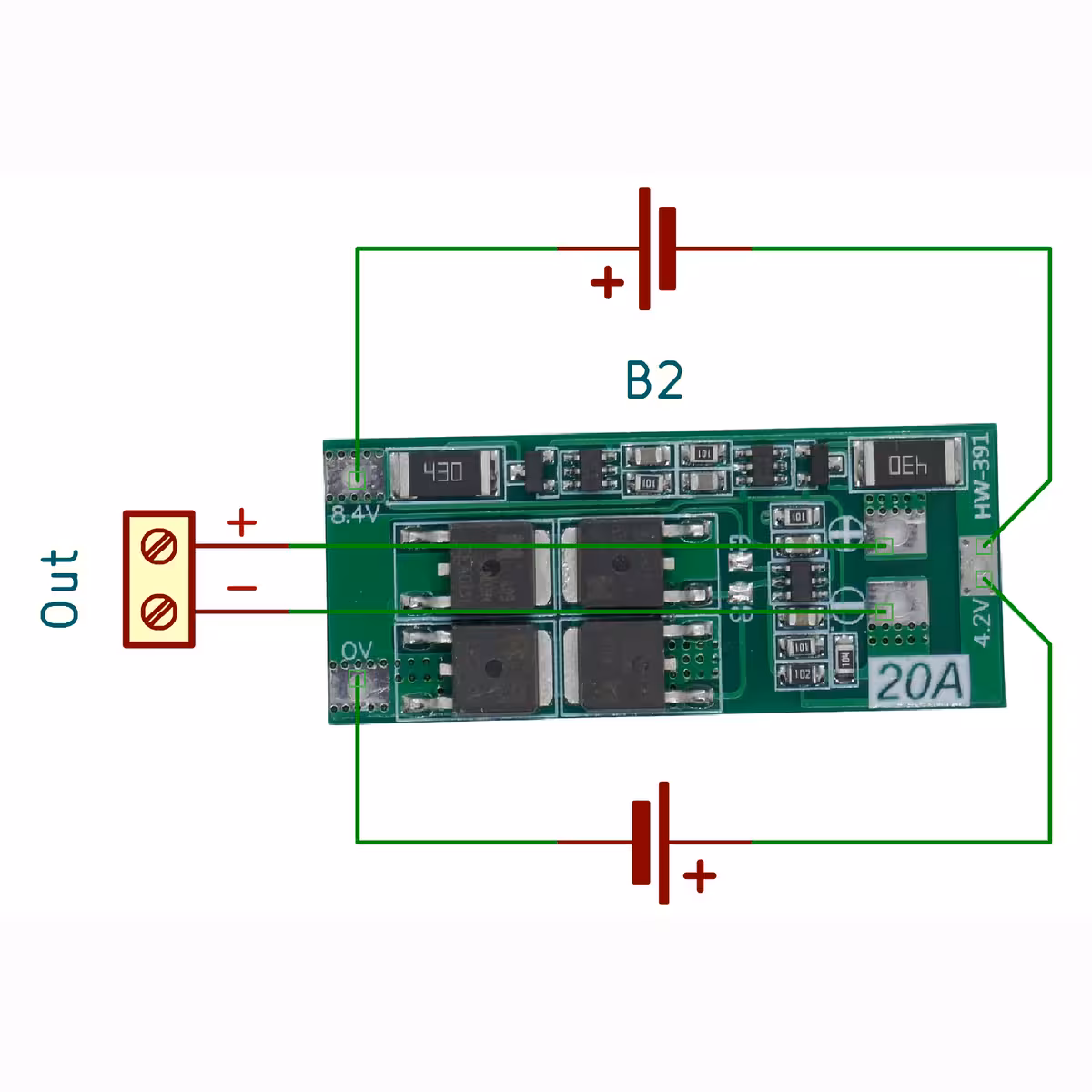• Dodržujte polarity 0V / 4.2V / 8.4V podle schématu.