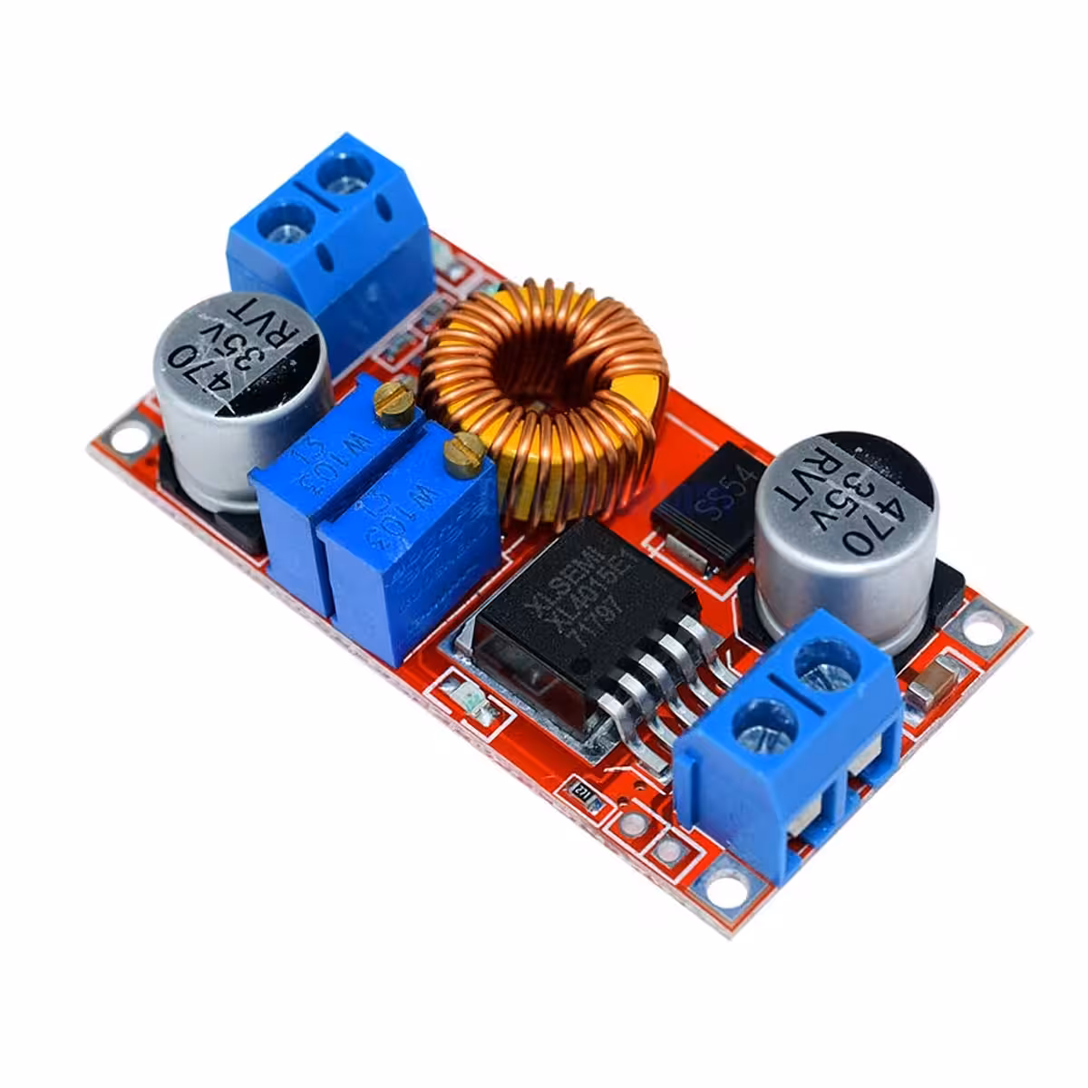 Modul XL4015 je vysoce účinný DC-DC step-down měnič s nastavitelným výstupem v rozmezí 1,25V až 36V a výstupním proudem až 5A (doporučeno maximálně 4,5A pro dlouhou životnost). Podporuje nastavení napětí (CV) a proudu (CC), ideální pro nabíjení baterií nebo napájení LED diod.