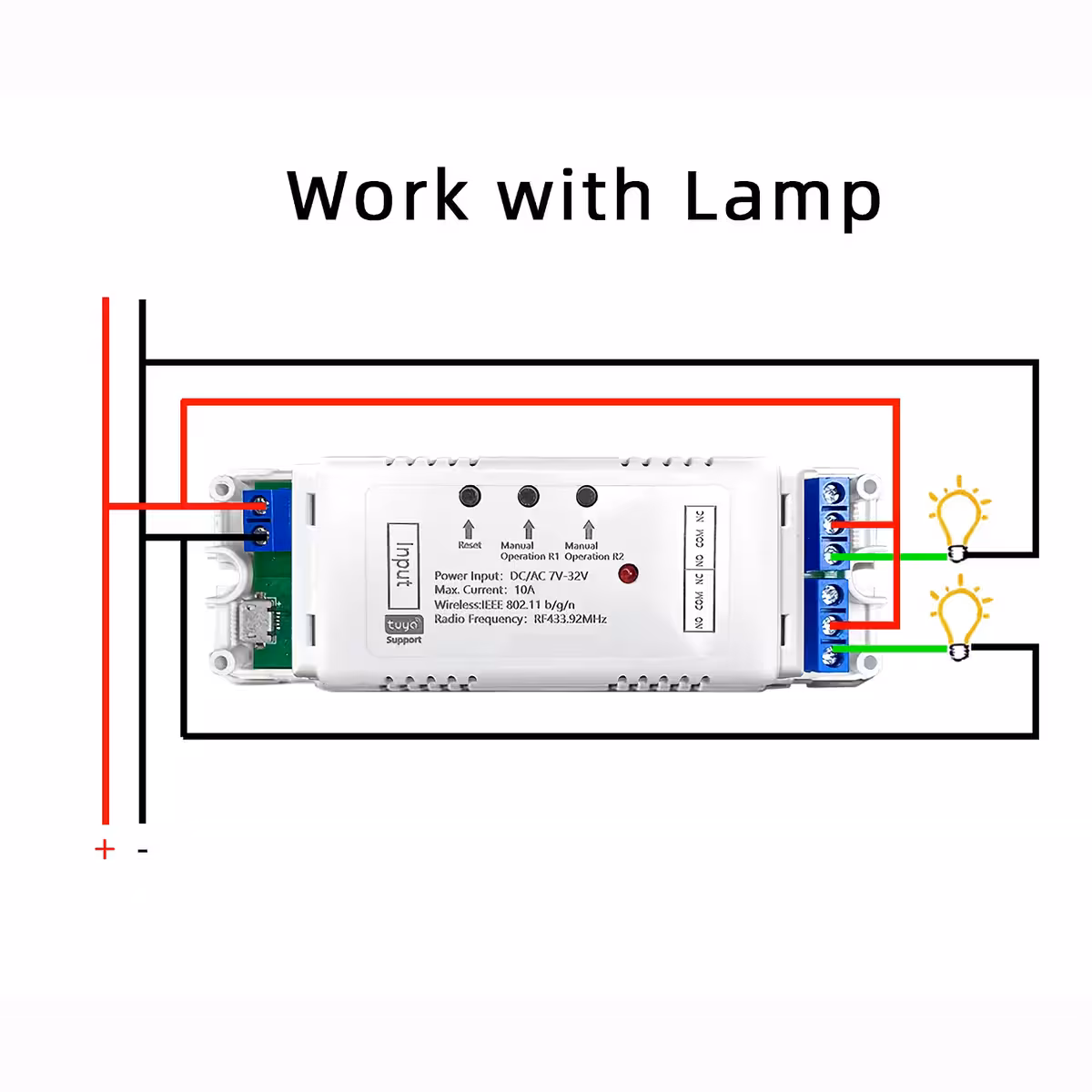 Bezdrátový WiFi spínač s 2 kanály a RF modulem 433MHz pro inteligentní dálkové ovládání přes aplikaci Tuya Smart Life a RF dálkový ovladač.
