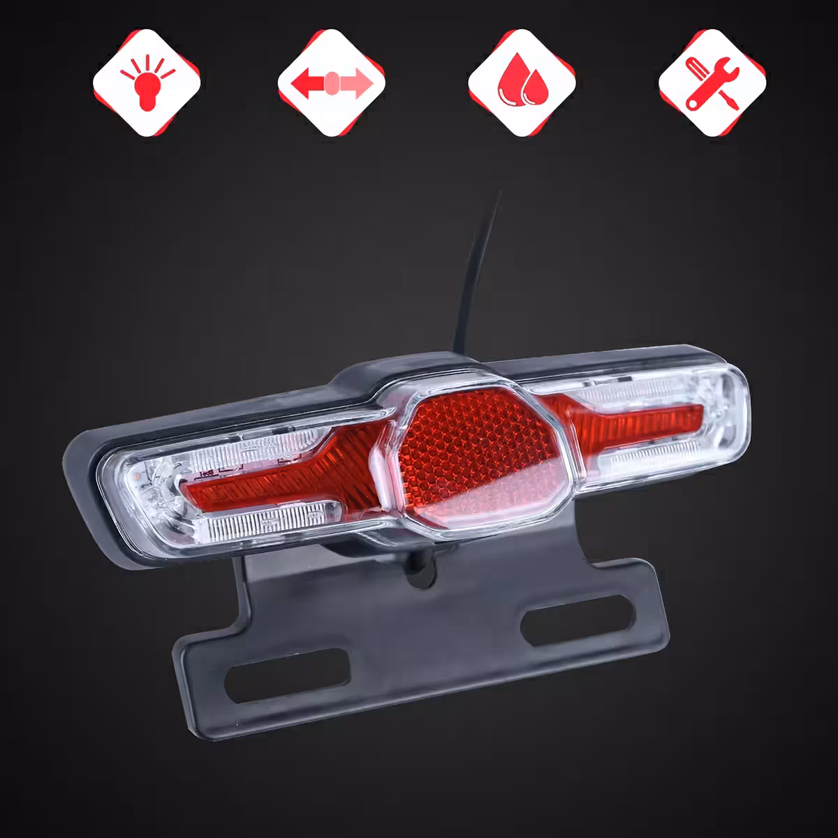 Multifunkční LED zadní lampa je ideální pro elektrické koloběžky, elektrokola a elektrické skútry. Nabízí funkce směrových světel vlevo/vpravo, pozičního světla pro noc a brzdového světla.